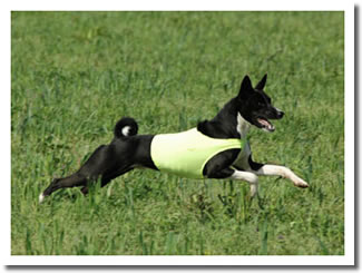 The Basenji is a small, short haired hunting dog from Africa. It is short backed and lightly built, appearing high on the leg compared to its length. The wrinkled head is proudly carried on a well arched neck and the tail is set high and curled.