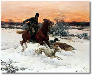 The Chart Polski hunted hare, deer, and wolves in his homeland, and the Chart Polski of today is only a few generations from the working/hunting hounds of Poland. During the chase, besides being extremely fast with great endurance, the Chart Polski is also very skillful and persistent - reacting quickly, confidently, and displaying great courage under fire